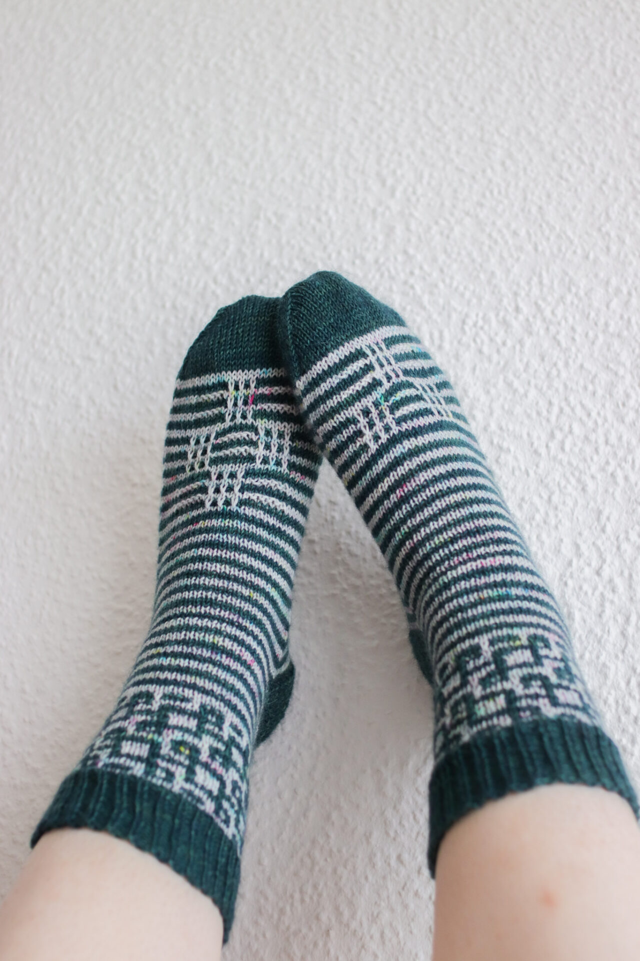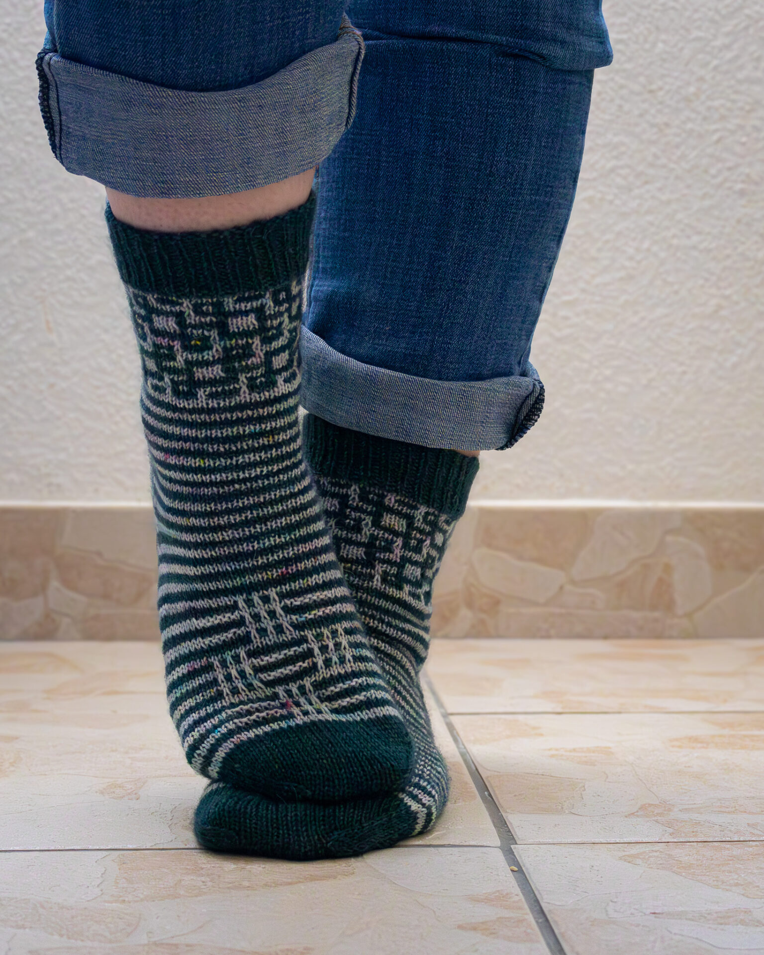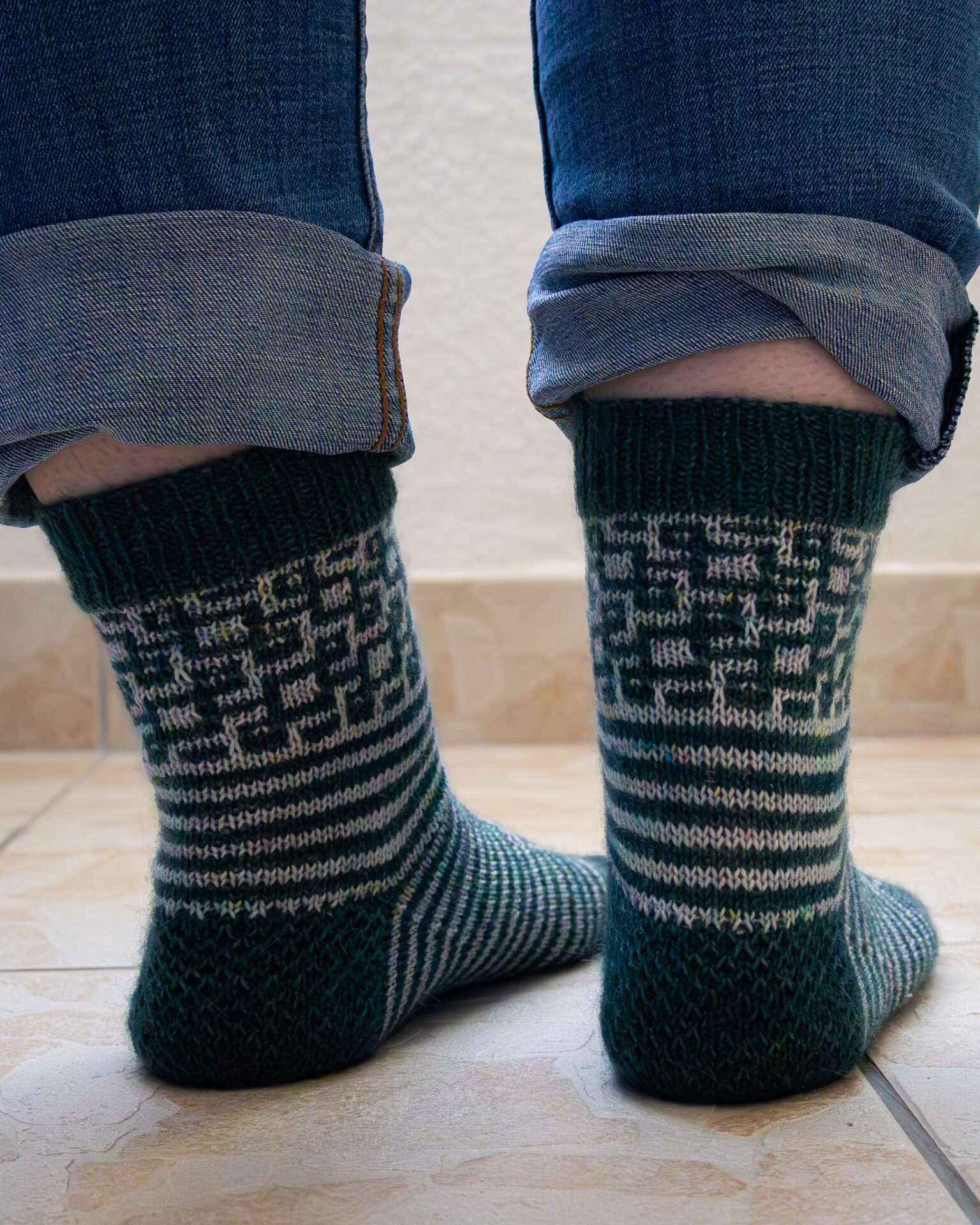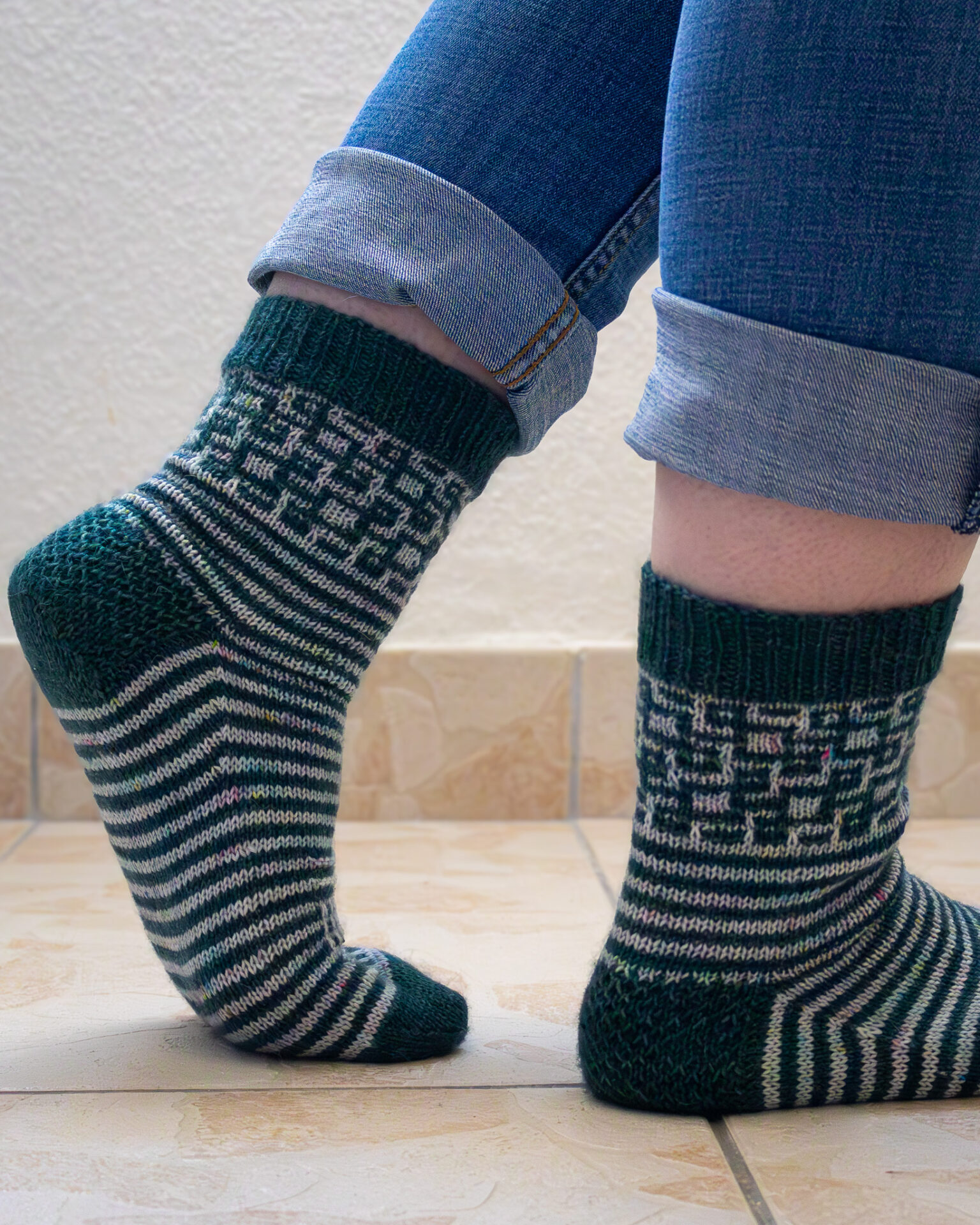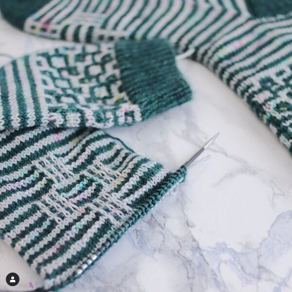 Il y a souvent plus d’une façon d’aller d’un point à un autre. De la même façon, les deux motifs de points mosaïque présentés sur ces chaussettes vous permettront d’explorer cette technique de tricot bicolore facilement.